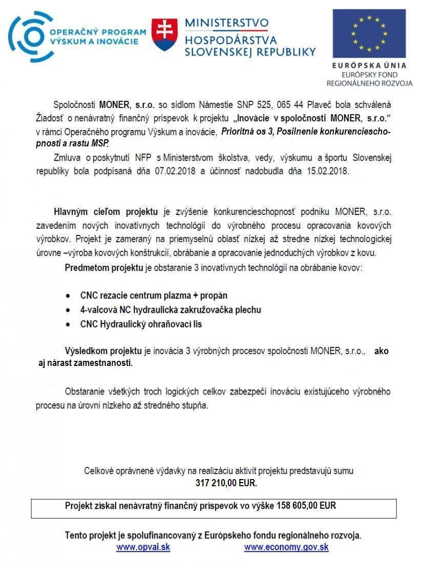 Spoločnosti MONER, s.r.o. so sídlom Lipová Aleja 512/75, 065 44 Plaveč bola schválená Žiadosť o nenávratný finančný príspevok k projektu „Inovácie v spoločnosti MONER, s.r.o.“ v rámci Operačného programu Výskum a inovácie, Prioritná os 1, Investičná priorita 1.2